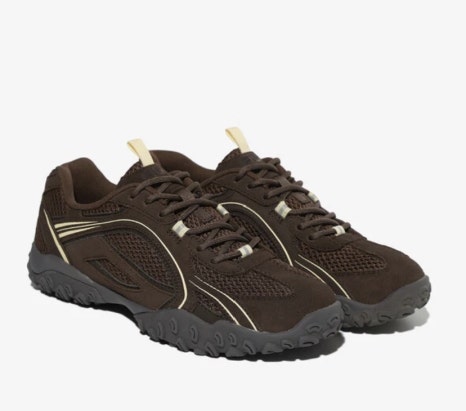 그녀가 착용한 운동화는 휠라의 ‘에샤페 초코’입니다. 1995년에 출시된 TERRAIN CRUSHER 제품을 현대적으로 재해석한 모델이죠. 브라운 색을 바탕으로 아이보리 색의 스포티한 라인이 포인트로 들어가 있는 해당 제품은 꾸준히 유행하고 있는 고프 코어의 감성을 살리고 있어 트렌디함을 놓치지 않고 있는 모습입니다.